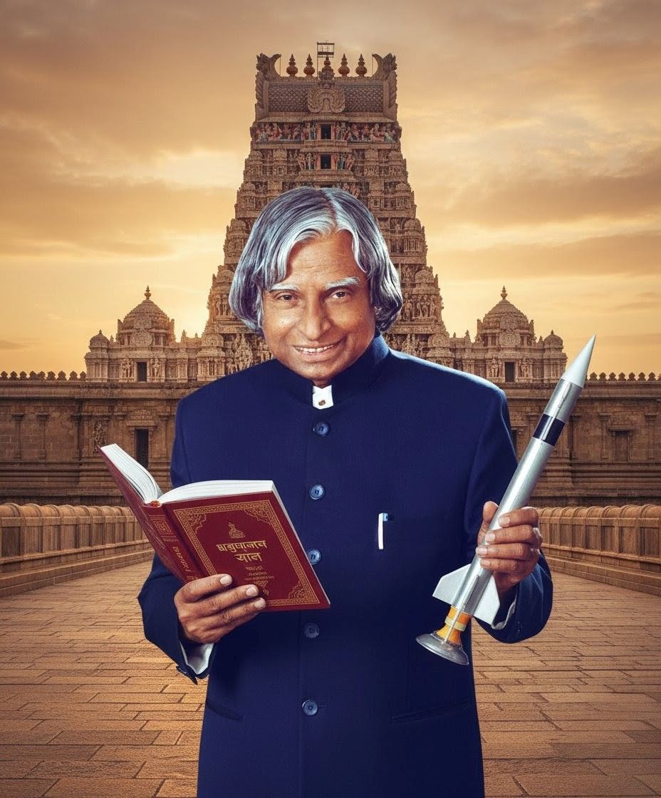 APJ Abdul Kalam was from a Muslim family, but his heart was also deeply connected to Hindu scriptures and Indian spiritual thought (Ramayana and Bhagavad Gita). In his childhood spiritual mentor Pramukh Swami Maharajand he was surrounded by Rameswaram temples, puja-path and Hindu rituals.