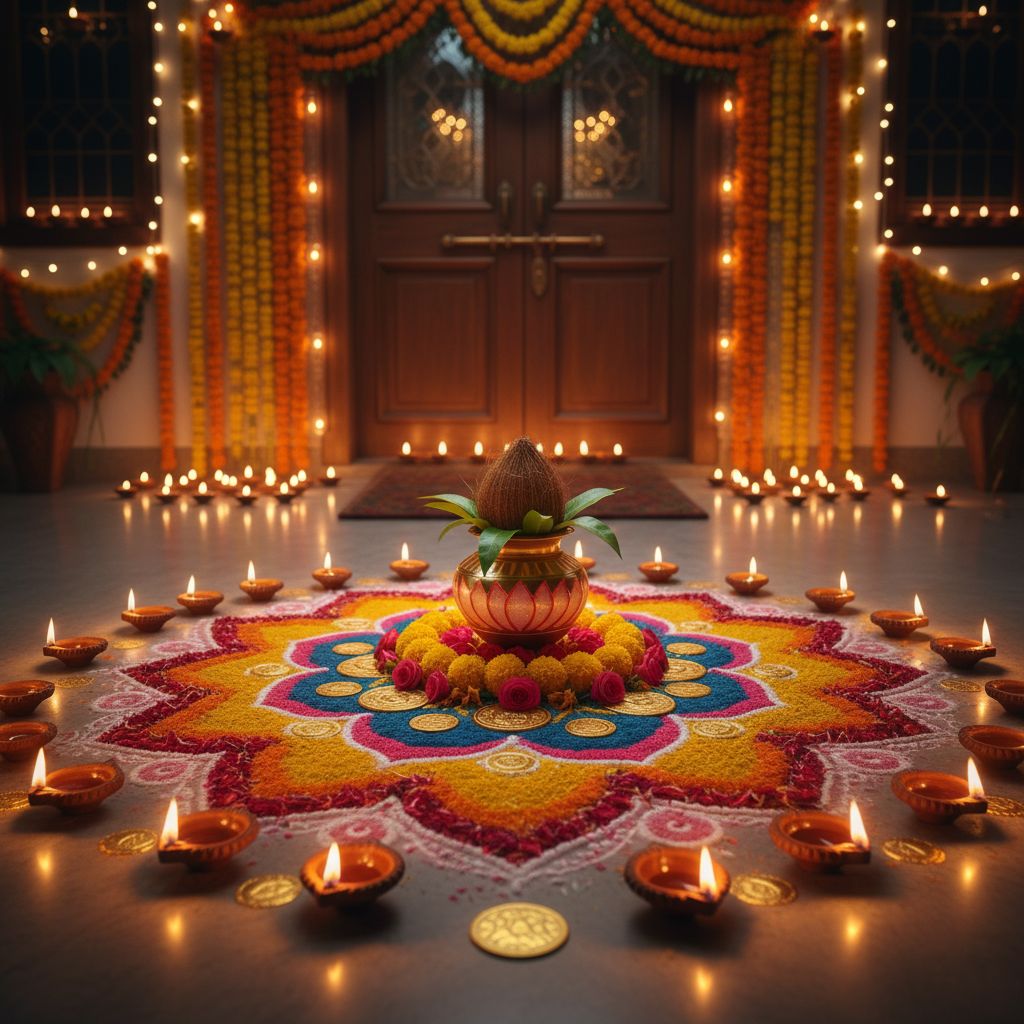 The most popular design is the Kalasha Dhanteras Rangoli, which features a pot with a lamp, lotus, and coins. This symbolizes wealth and prosperity.